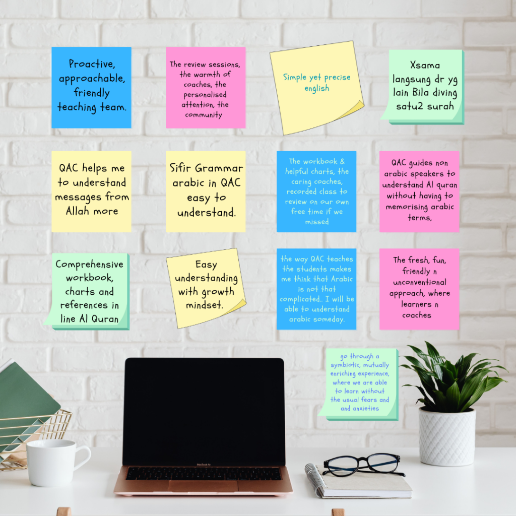 I came across QAC while browsing the Qalby App. I love the learning approach adopted at QAC which is conducted in a very relaxed, humble and non-threatening environment. QAC has made the learning of Arabic, which is one of the hardest language to learn, enjoyable and easy. I like the way our coaches guide us to focus “one at a time” and to put aside what we haven’t learned to “KIV”. Also, QAC did not focus too much on the technical grammatical Arabic terms. By doing this, I don’t feel overwhelmed and neither do I experience information overload during the learning process. All these have made my QAL learning process enjoyable. The wonderful thing about QAC is; it is not only about learning the Arabic Language, but also provides Class Review sessions and TADABBUR! In the past 1 month, I gained spiritual enrichment through personal reflections of the words of Allah. Just short ayats but has shaken me to the core. SubhanAllah! This is something that I value dearly. Alhamdulillah thanks to Allah for providing me with this rizq. May Allah bless all of us.